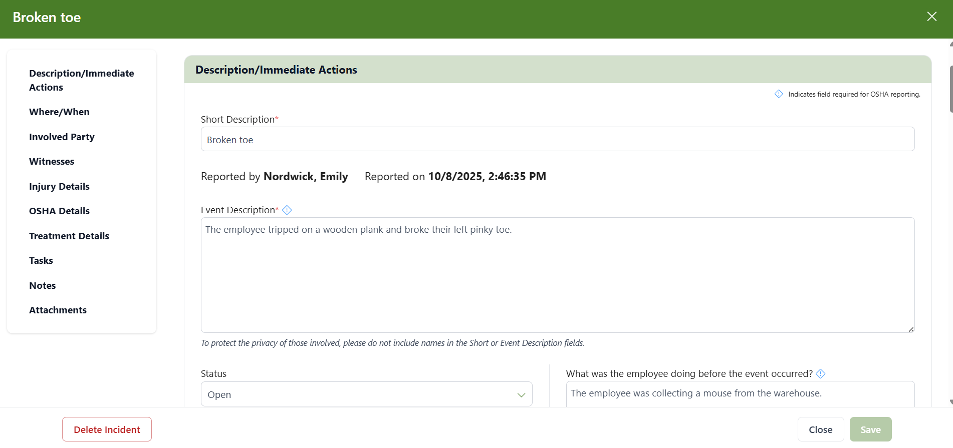 All details from the initial report are available for you to review and edit. You can update the incident status and complete the remaining documentation fields, which may vary depending on the type of incident.