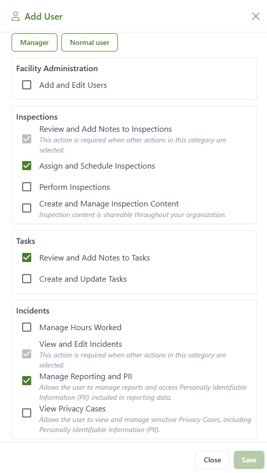 users to your organization. You can add users to the system by navigating to the My Organization page. Once invited, the new user will receive a welcome email. Once they have provisioned their account, they will be an active member of your organization. When adding users you can assign user roles and facility level access. A users roles apply to them at all facilities they have access to. User Roles are additive, meaning you can assign a user to multiple roles to ensure they have the permissions necessary to perform their daily tasks. When Adding a user- just select the actions you'd like them to perform. You can also use the suggested sets of roles for "Manager" and "Normal User".