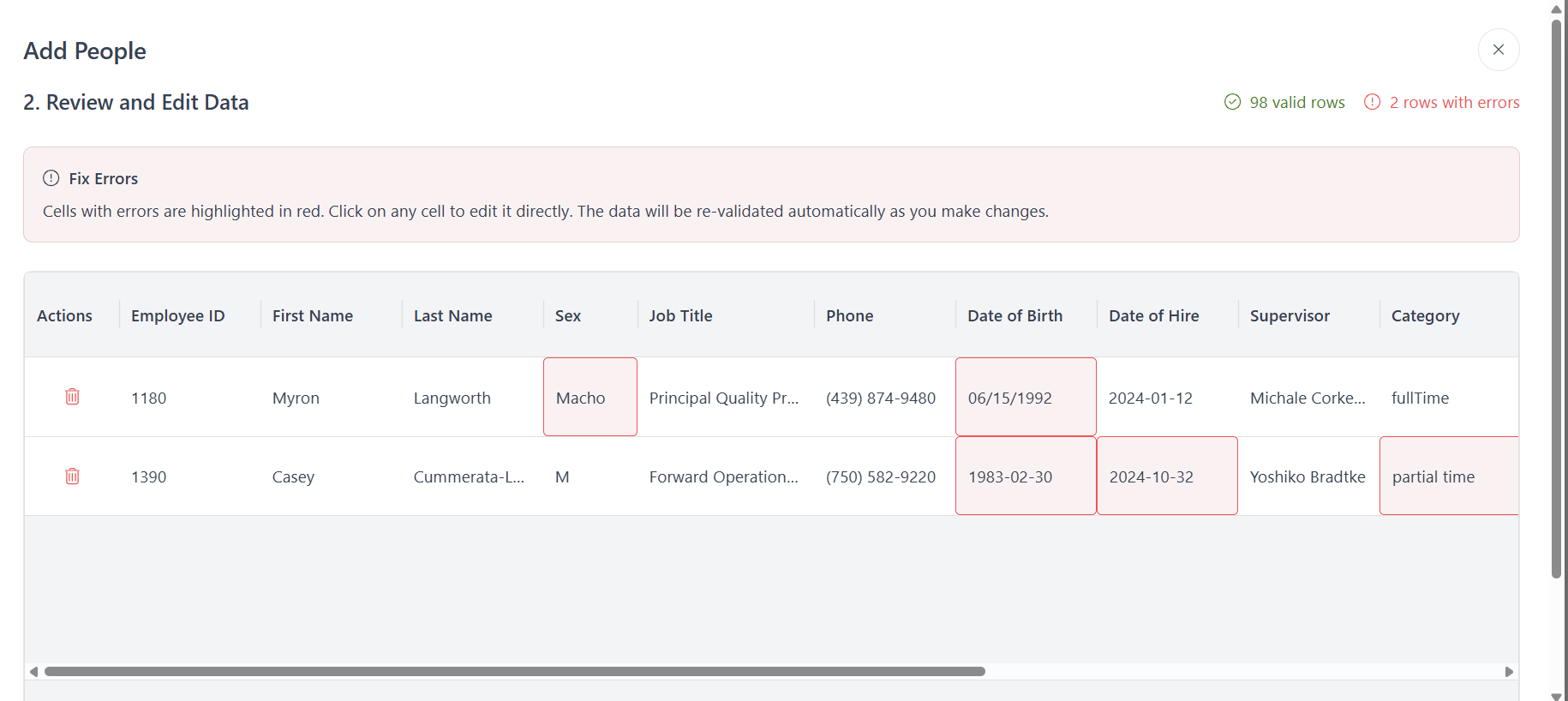 If errors are found, they will be highlighted for you. You can correct them directly in the help screens or update your .csv file and try again.